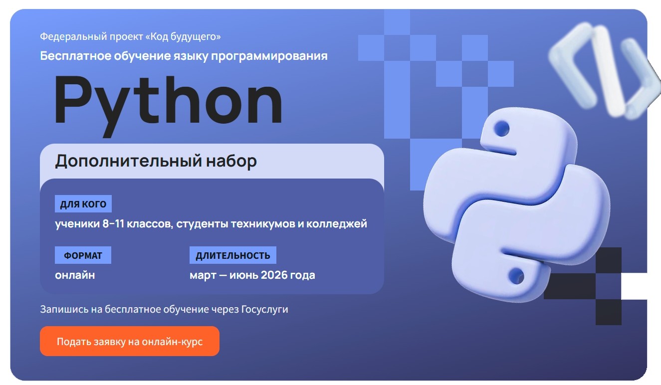 Платформа Учи.Дома объявляет дополнительный набор учащихся 8–11 классов, а студентам СПО, обучающихся по IT-специальностям, предлагается на безвозмездной основе, за счет государственной субсидии, пройти онлайн-курс программирования на Python.
